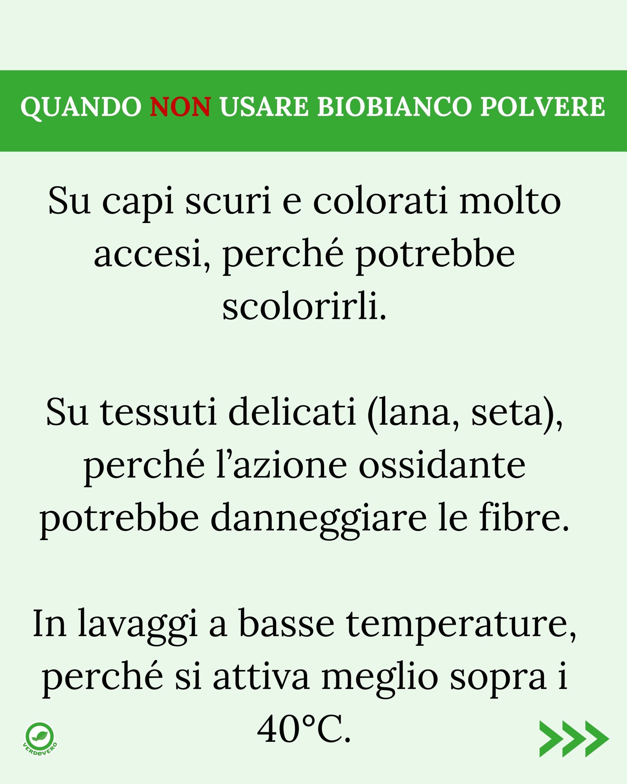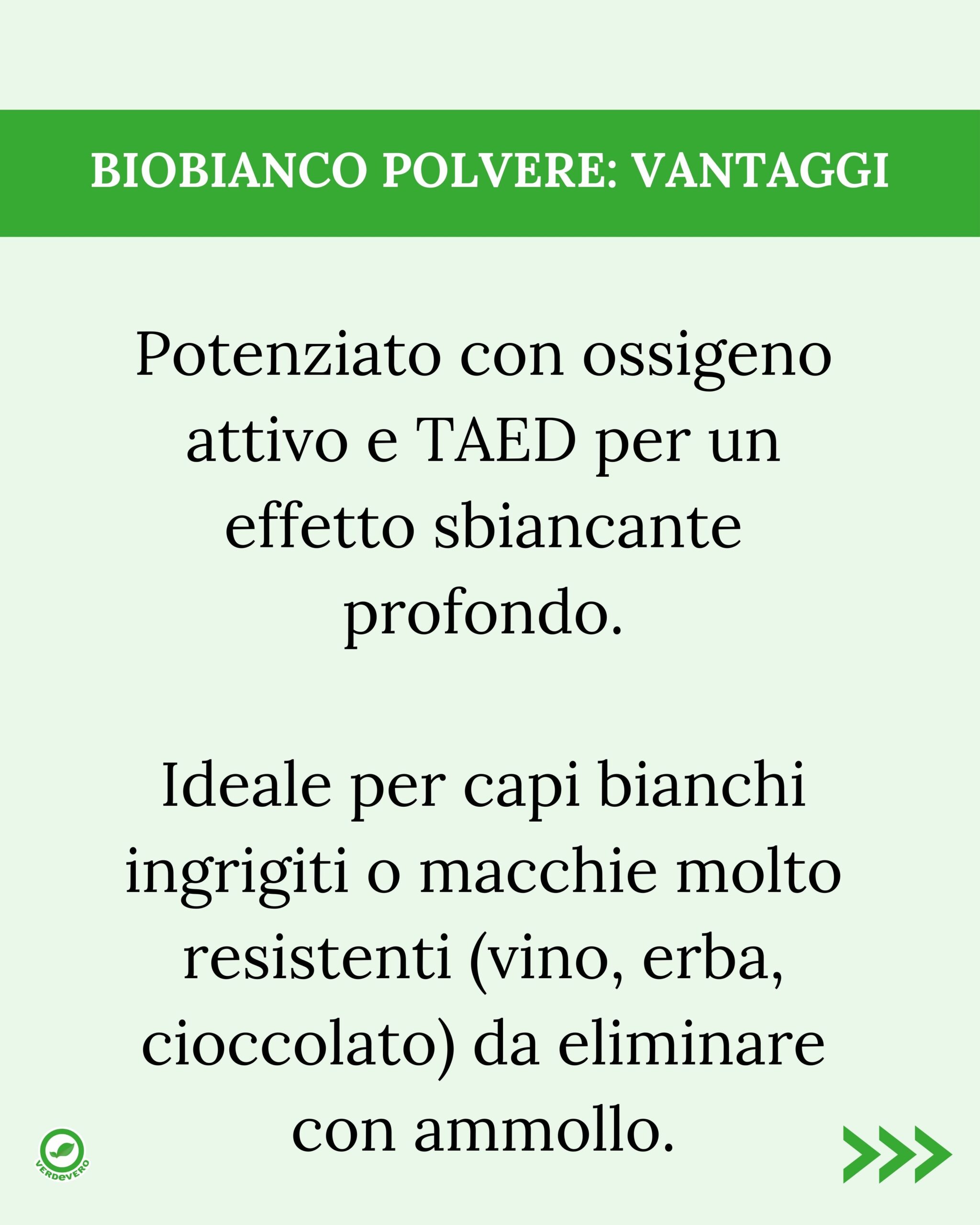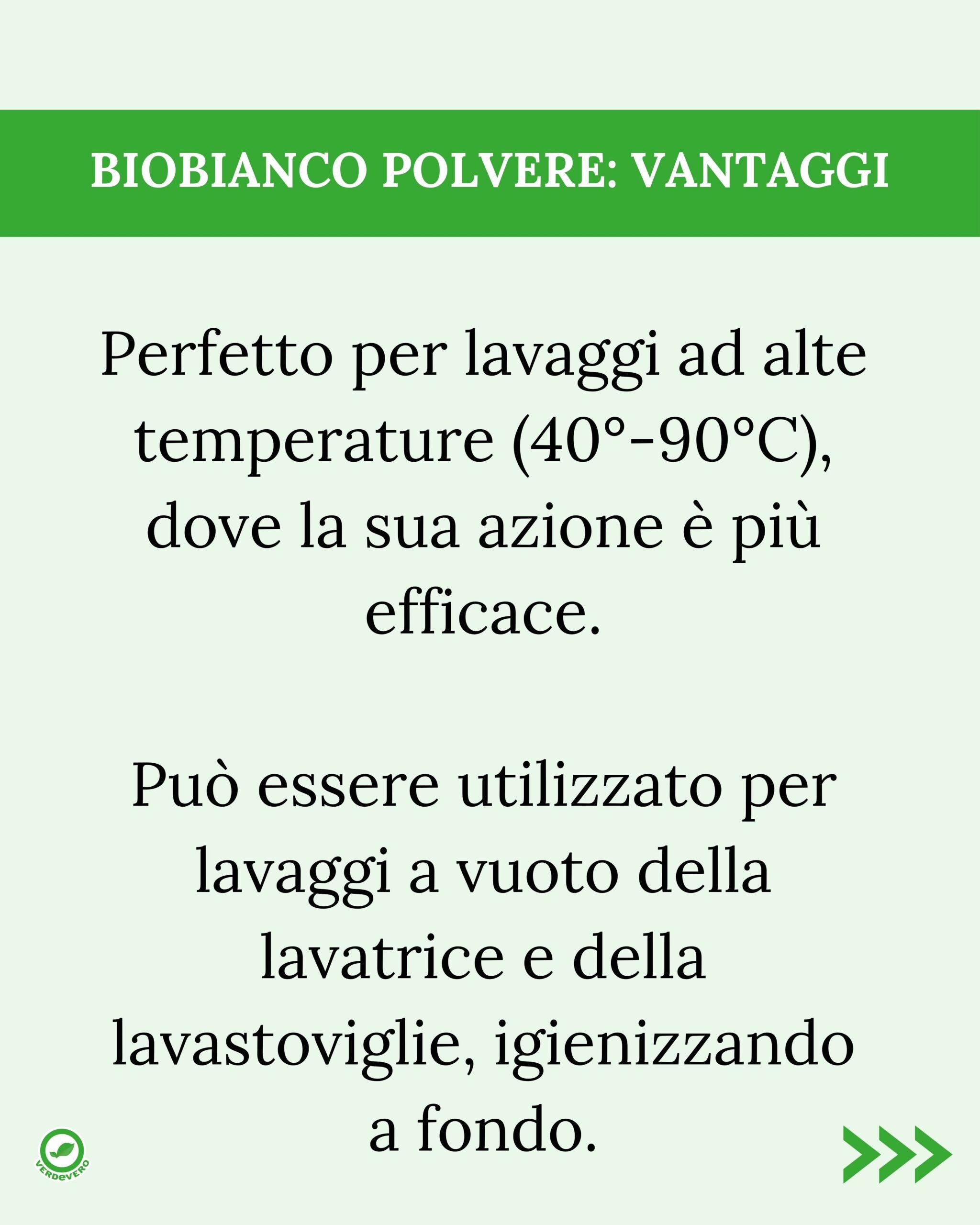 - BIOBIANCO POLVERE è la scelta ideale per lavaggi intensivi, capi bianchi ingrigiti e igienizzazione profonda di elettrodomestici come lavatrici e lavastoviglie.